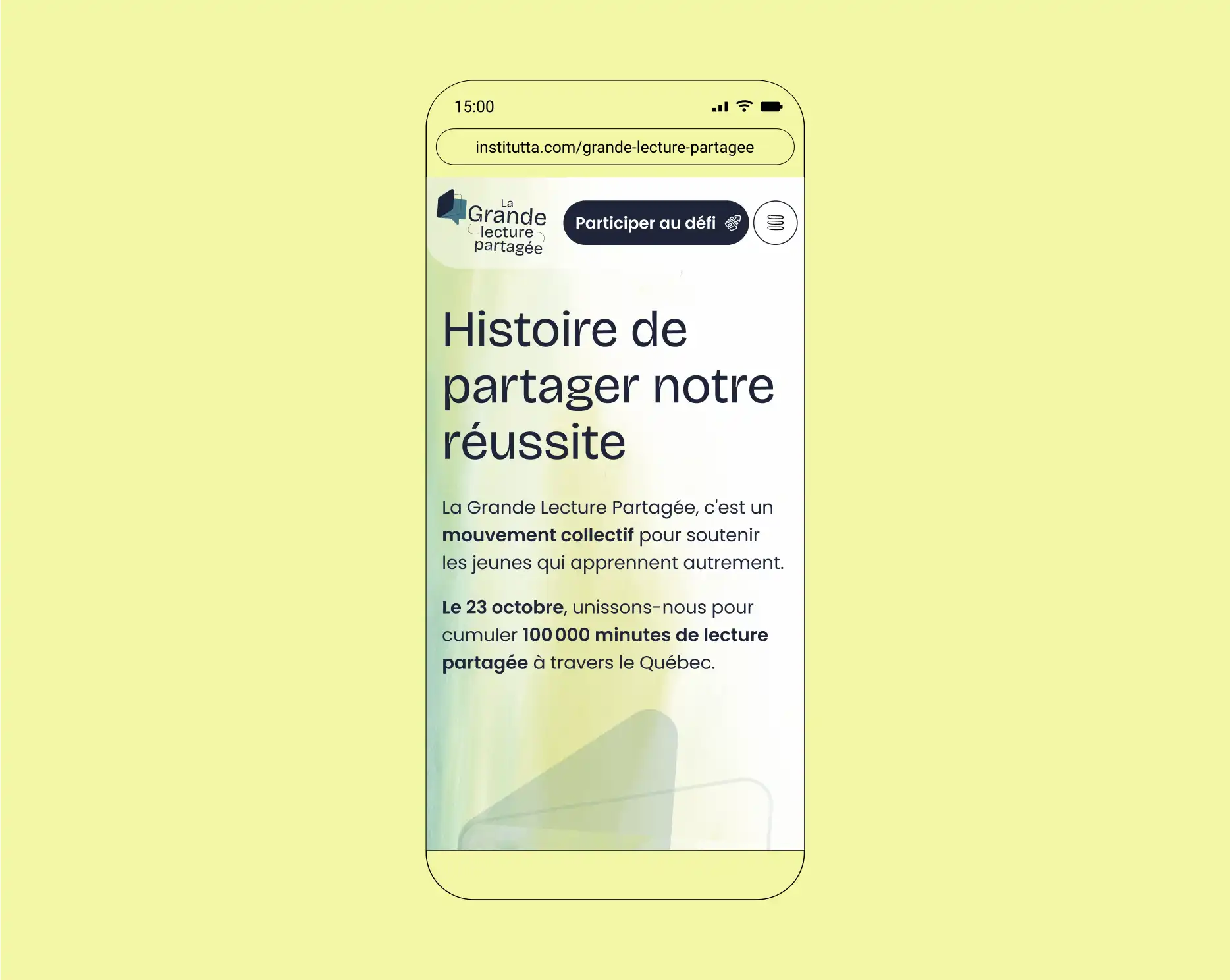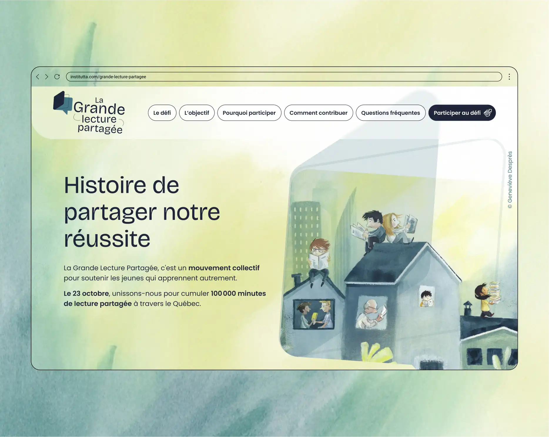 Pour l’Institut des troubles d’apprentissage (Institut TA), nous avons conçu l’UX et l’UI du site web La Grande lecture partagée, un mouvement collectif qui incite familles, écoles et communautés à multiplier les moments de lecture.